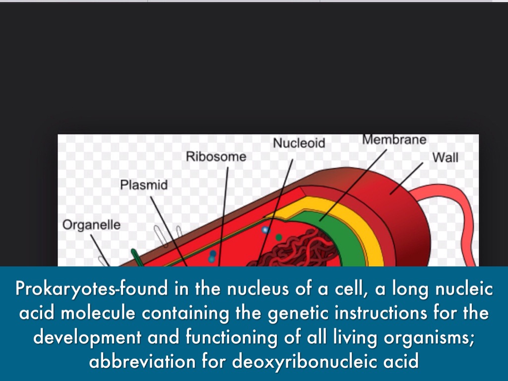 Prokaryotes-found in the nucleus of a cell, a long nucleic acid molecule containing the genetic instructions for the development and functioning of all living organisms; abbreviation for deoxyribonucleic acid