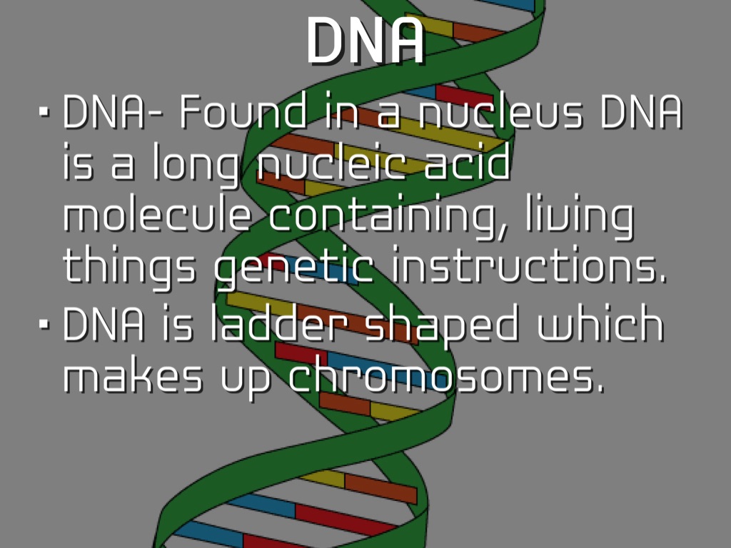 DNA- Found in a nucleus DNA is a long nucleic acid molecule containing, living things genetic instructions.