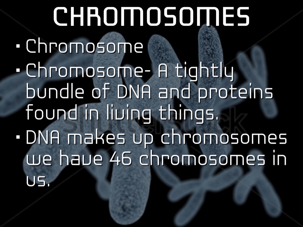 Chromosome- A tightly bundle of DNA and proteins found in living things.