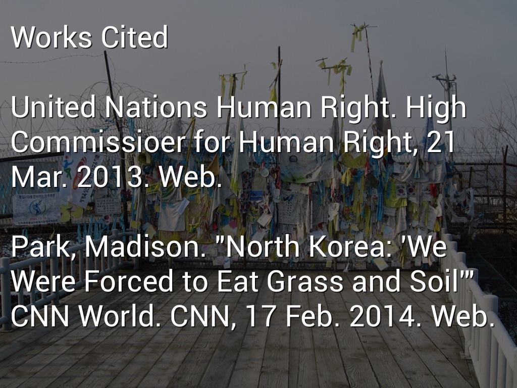 Park, Madison. "North Korea: 'We Were Forced to Eat Grass and Soil'" CNN World. CNN, 17 Feb. 2014. Web.