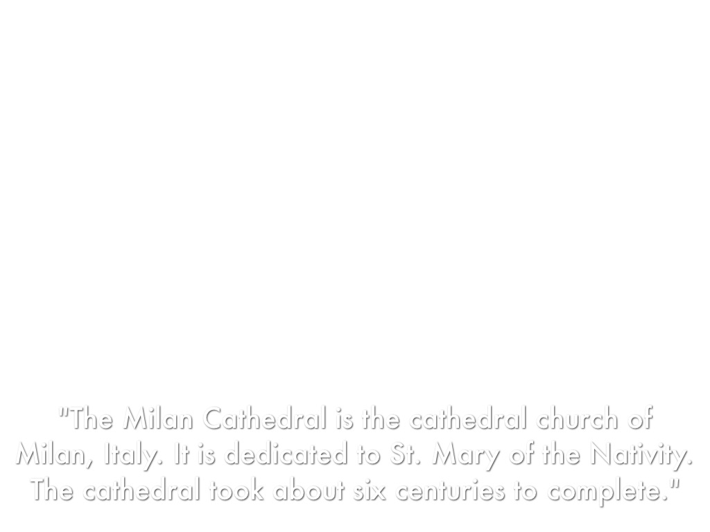 "The Milan Cathedral is the cathedral church of Milan, Italy. It is dedicated to St. Mary of the Nativity. The cathedral took about six centuries to complete."