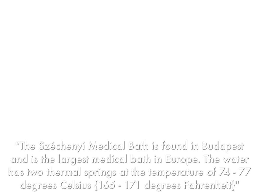 "The Széchenyi Medical Bath is found in Budapest and is the largest medical bath in Europe. The water has two thermal springs at the temperature of 74 - 77 degrees Celsius {165 - 171 degrees Fahrenheit}"
