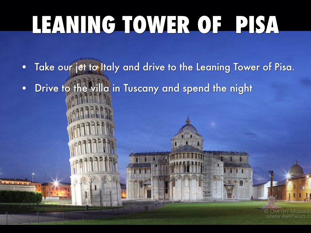 - Take our jet to Italy and drive to the Leaning Tower of Pisa.