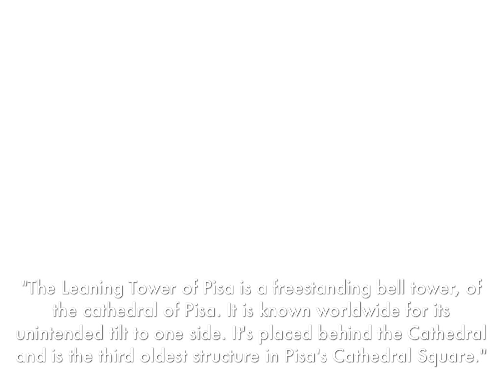 "The Leaning Tower of Pisa is a freestanding bell tower, of the cathedral of Pisa. It is known worldwide for its unintended tilt to one side. It's placed behind the Cathedral and is the third oldest structure in Pisa's Cathedral Square."