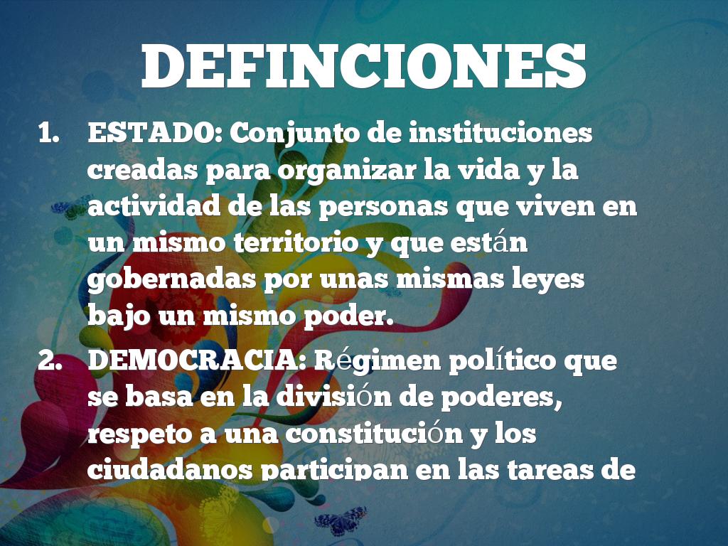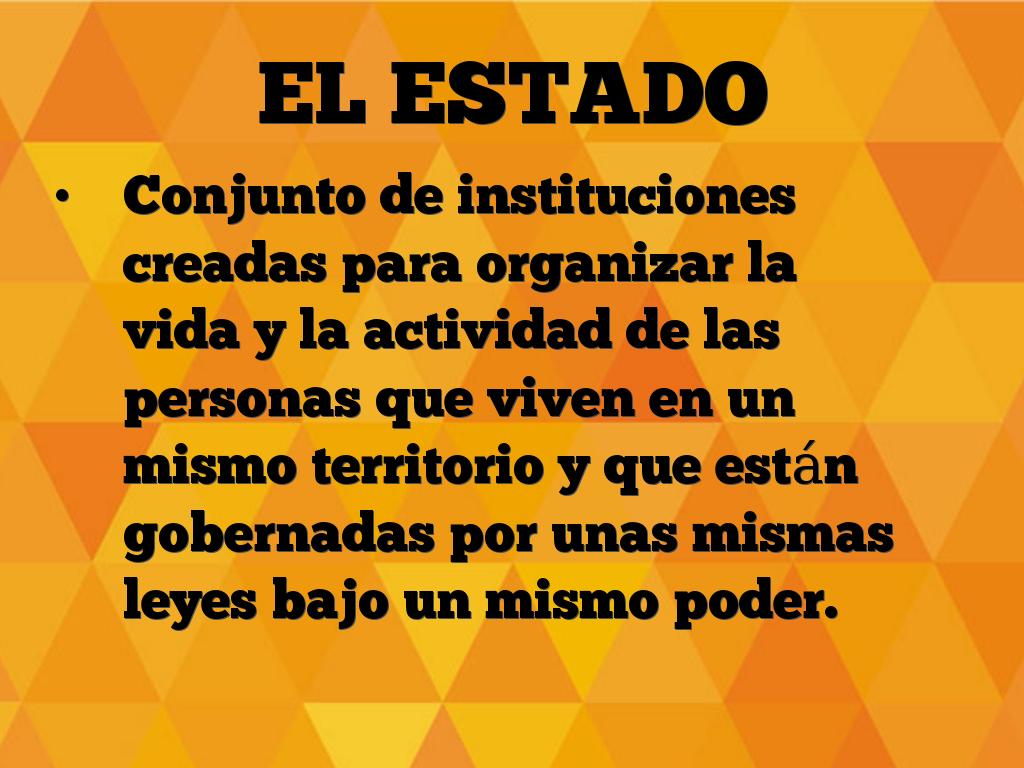 - ESTADO: Conjunto de instituciones creadas para organizar la vida y la actividad de las personas que viven en un mismo territorio y que están gobernadas por unas mismas leyes bajo un mismo poder.