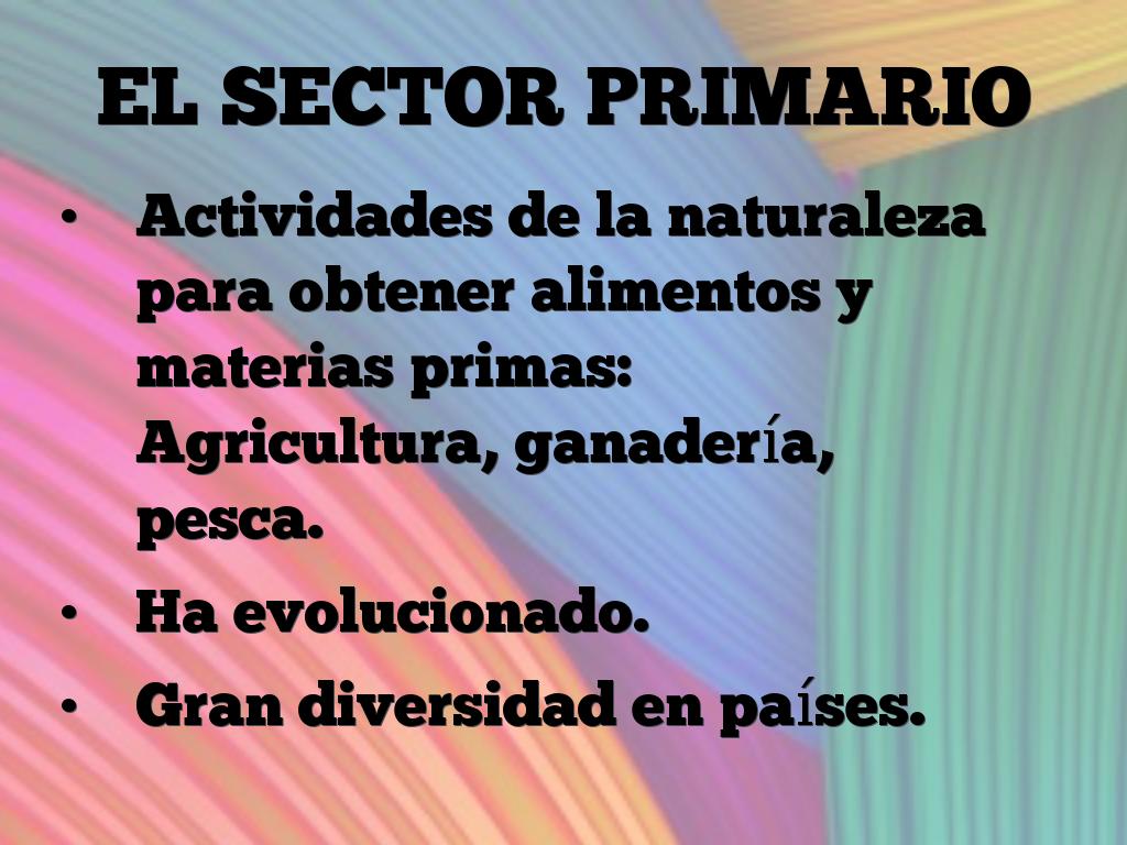 - Actividades de la naturaleza para obtener alimentos y materias primas: Agricultura, ganadería, pesca.