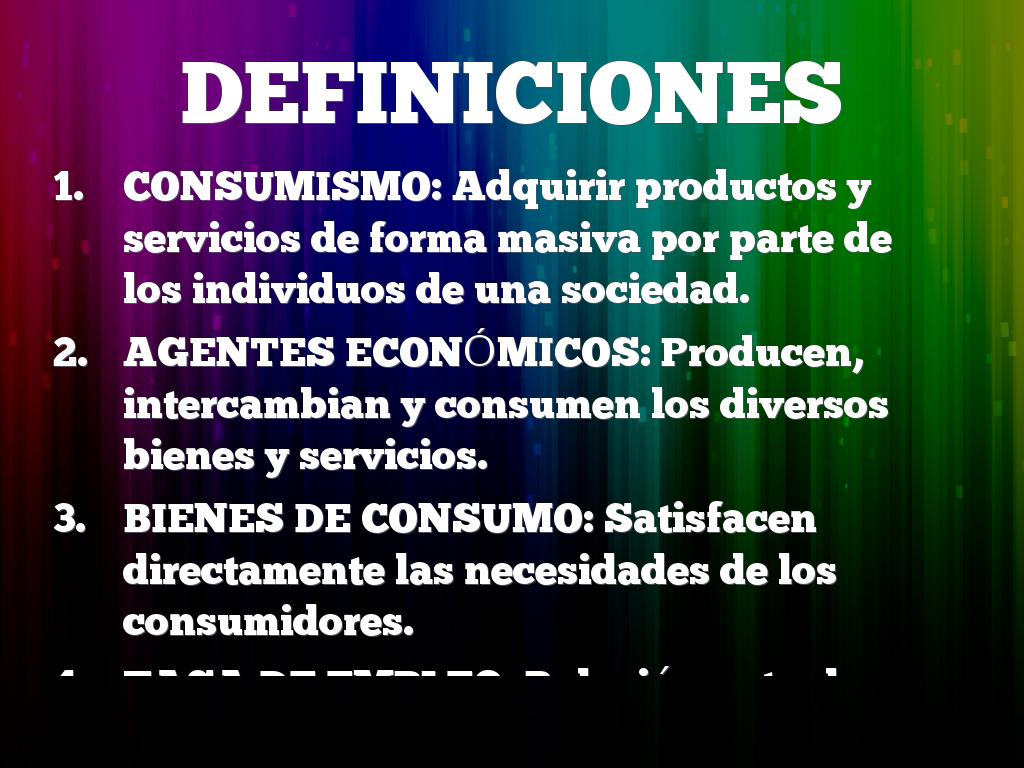 - CONSUMISMO: Adquirir productos y servicios de forma masiva por parte de los individuos de una sociedad.
