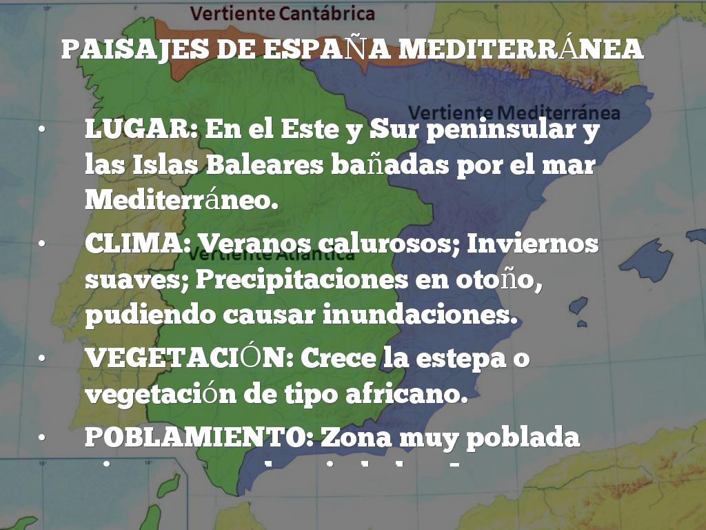 - LUGAR: En el Este y Sur peninsular y las Islas Baleares bañadas por el mar Mediterráneo.