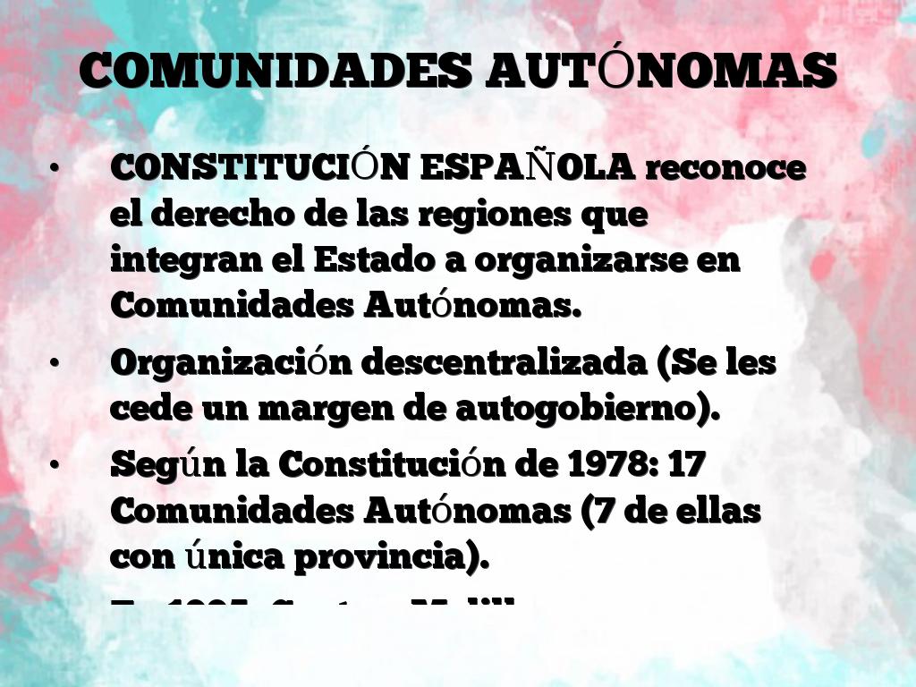 - CONSTITUCIÓN ESPAÑOLA reconoce el derecho de las regiones que integran el Estado a organizarse en Comunidades Autónomas.