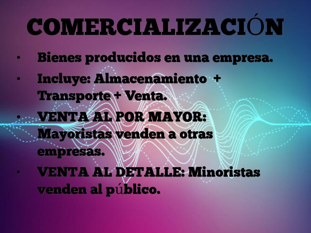 - VENTA AL POR MAYOR: Mayoristas venden a otras empresas.