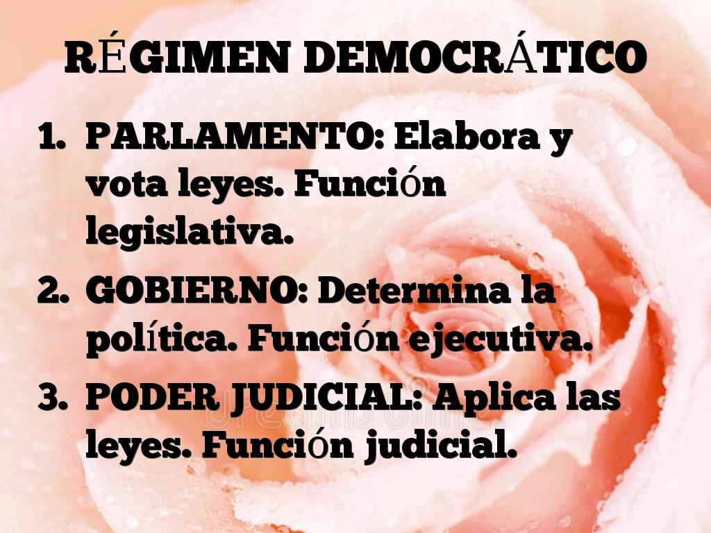 - Régimen político que se basa en la división de poderes, respeto a una constitución y los ciudadanos participan en las tareas de gobierno.