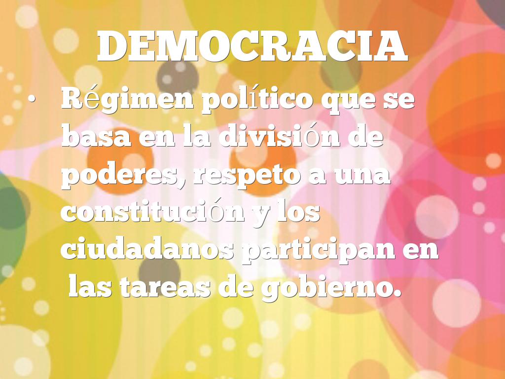 - DEMOCRACIA: Régimen político que se basa en la división de poderes, respeto a una constitución y los ciudadanos participan en las tareas de gobierno.