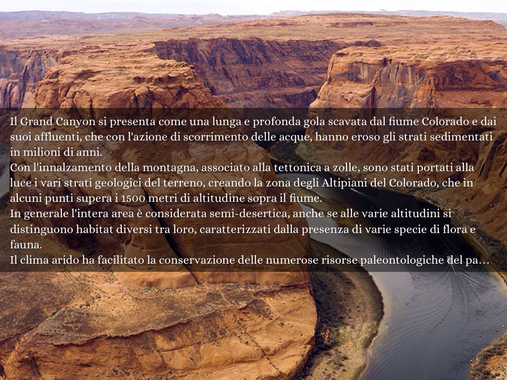 Il Grand Canyon si presenta come una lunga e profonda gola scavata dal fiume Colorado e dai suoi affluenti, che con l'azione di scorrimento delle acque, hanno eroso gli strati sedimentati in milioni di anni.