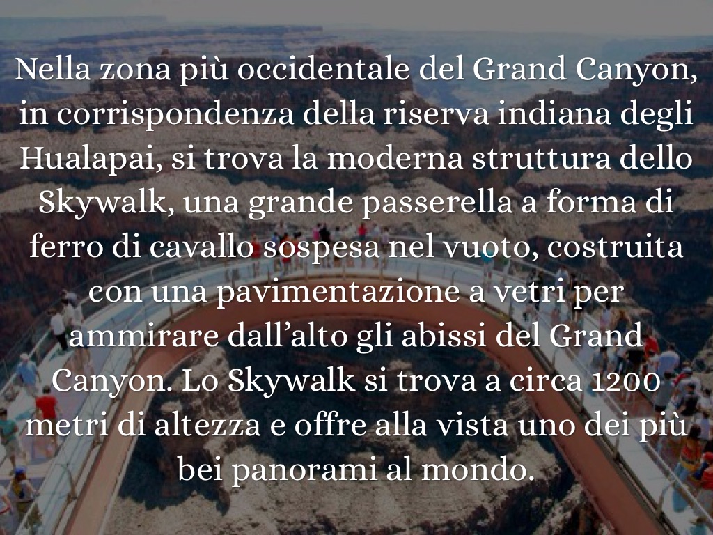 Nella zona più occidentale del Grand Canyon, in corrispondenza della riserva indiana degli Hualapai, si trova la moderna struttura dello Skywalk, una grande passerella a forma di ferro di cavallo sospesa nel vuoto, costruita con una pavimentazione a vetri per ammirare dall’alto gli abissi del Grand Canyon. Lo Skywalk si trova a circa 1200 metri di altezza e offre alla vista uno dei più bei panorami al mondo.