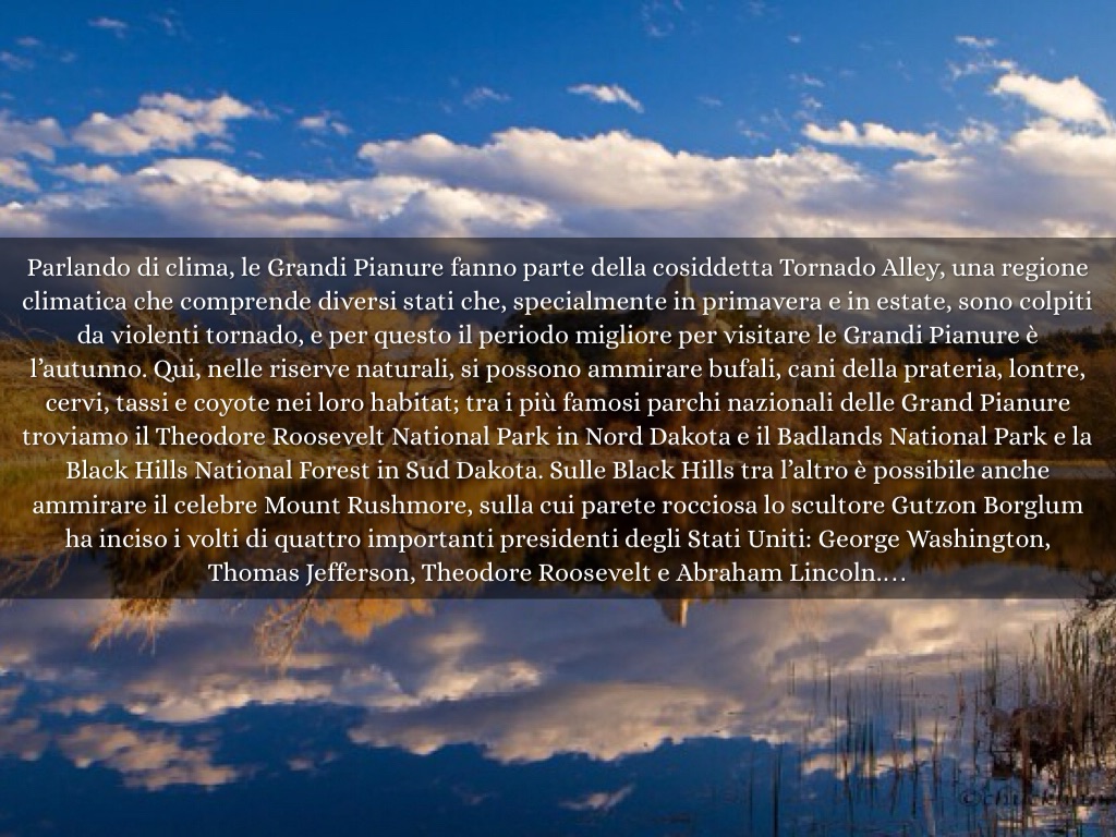 Parlando di clima, le Grandi Pianure fanno parte della cosiddetta Tornado Alley, una regione climatica che comprende diversi stati che, specialmente in primavera e in estate, sono colpiti da violenti tornado, e per questo il periodo migliore per visitare le Grandi Pianure è l’autunno. Qui, nelle riserve naturali, si possono ammirare bufali, cani della prateria, lontre, cervi, tassi e coyote nei loro habitat; tra i più famosi parchi nazionali delle Grand Pianure troviamo il Theodore Roosevelt National Park in Nord Dakota e il Badlands National Park e la Black Hills National Forest in Sud Dakota. Sulle Black Hills tra l’altro è possibile anche ammirare il celebre Mount Rushmore, sulla cui parete rocciosa lo scultore Gutzon Borglum ha inciso i volti di quattro importanti presidenti degli Stati Uniti: George Washington, Thomas Jefferson, Theodore Roosevelt e Abraham Lincoln.