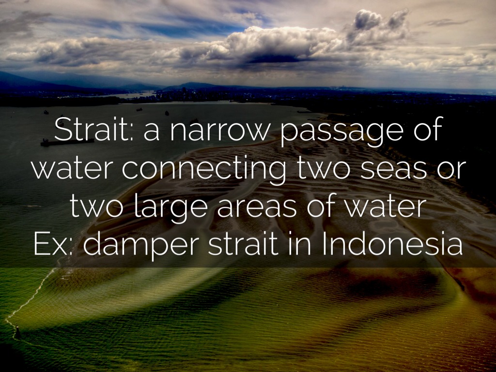 Strait: a narrow passage of water connecting two seas or two large areas of water