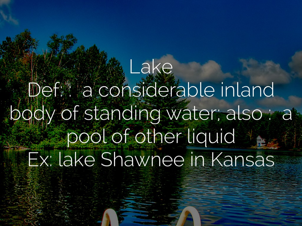 Def: : a considerable inland body of standing water; also : a pool of other liquid