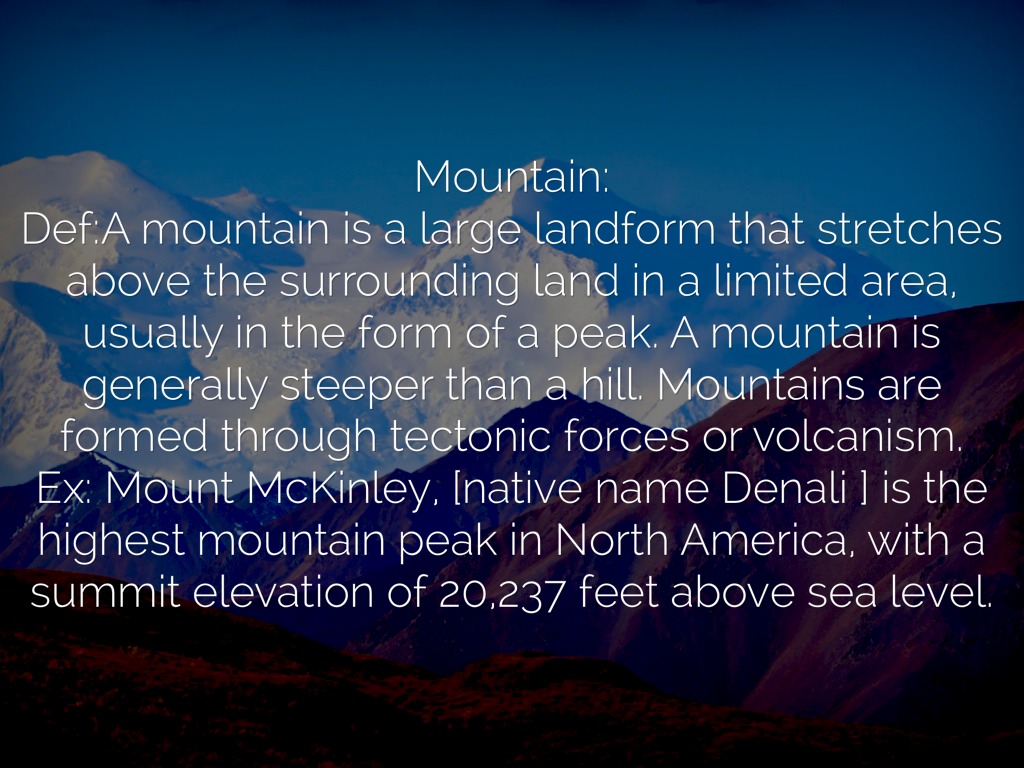 Def:A mountain is a large landform that stretches above the surrounding land in a limited area, usually in the form of a peak. A mountain is generally steeper than a hill. Mountains are formed through tectonic forces or volcanism.