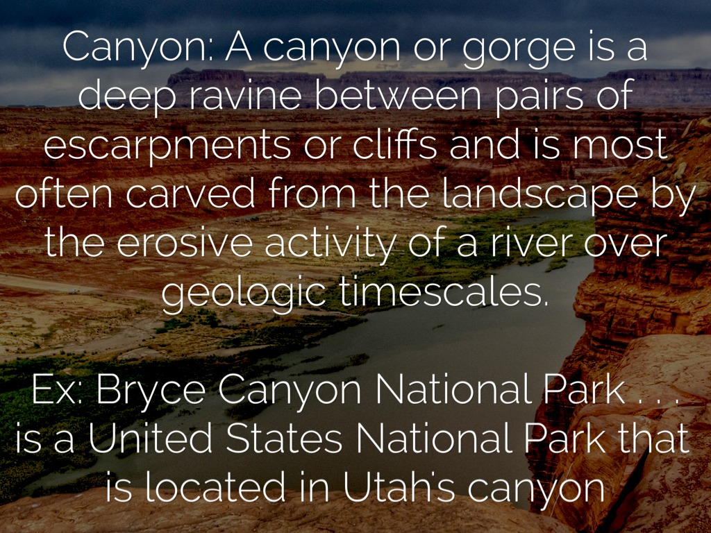 Canyon: A canyon or gorge is a deep ravine between pairs of escarpments or cliffs and is most often carved from the landscape by the erosive activity of a river over geologic timescales.