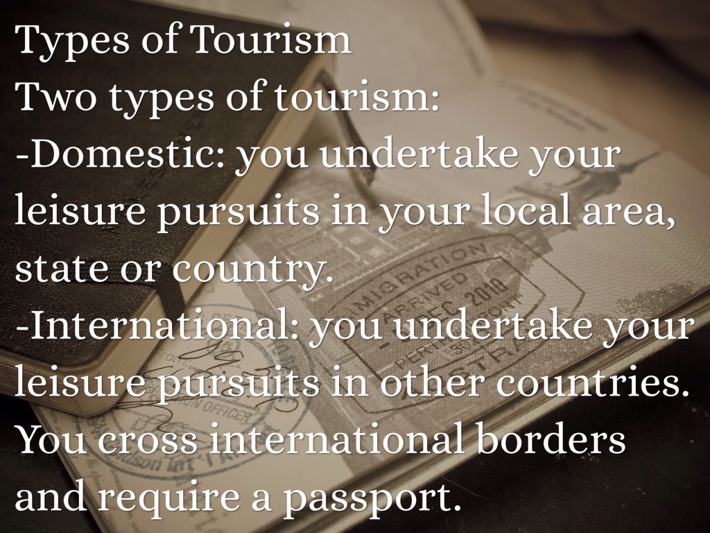 Types of Tourism Two types of tourism: -Domestic: you undertake your leisure pursuits in your local area, state or country. -International: you undertake your leisure pursuits in other countries. You cross international borders and require a passport.
