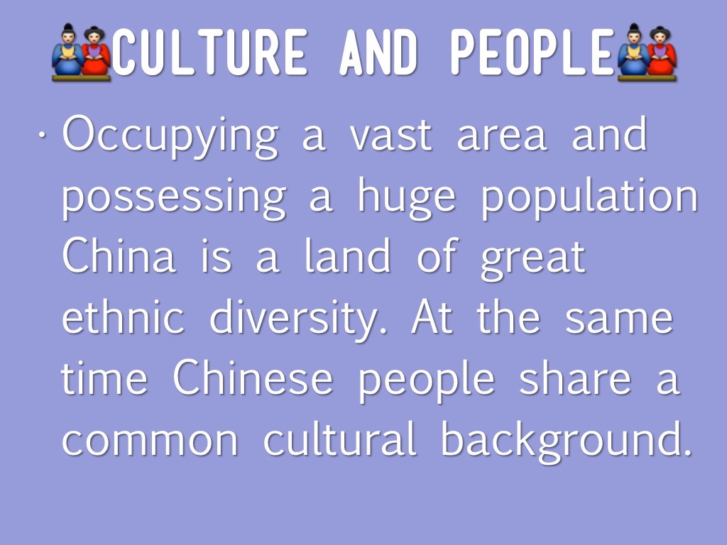• Occupying a vast area and possessing a huge population China is a land of great ethnic diversity. At the same time Chinese people share a common cultural background.