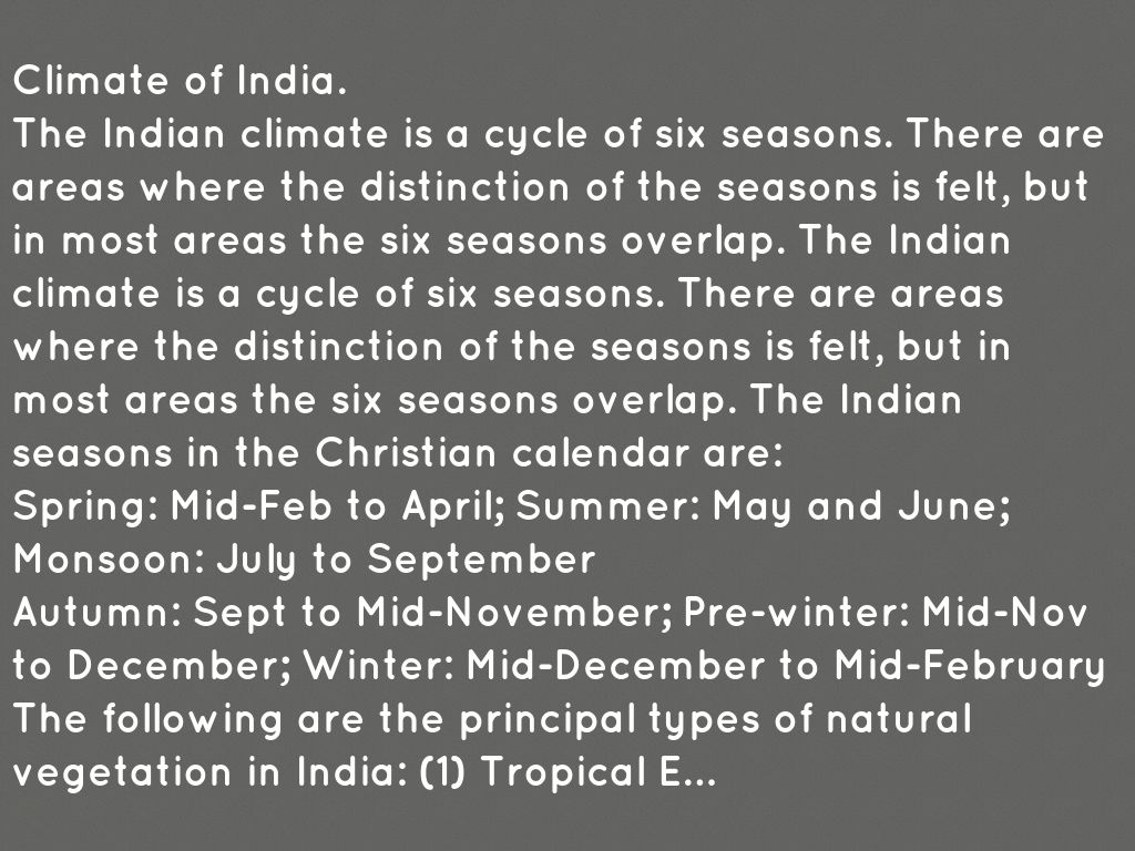The Indian climate is a cycle of six seasons. There are areas where the distinction of the seasons is felt, but in most areas the six seasons overlap. The Indian climate is a cycle of six seasons. There are areas where the distinction of the seasons is felt, but in most areas the six seasons overlap. The Indian seasons in the Christian calendar are: