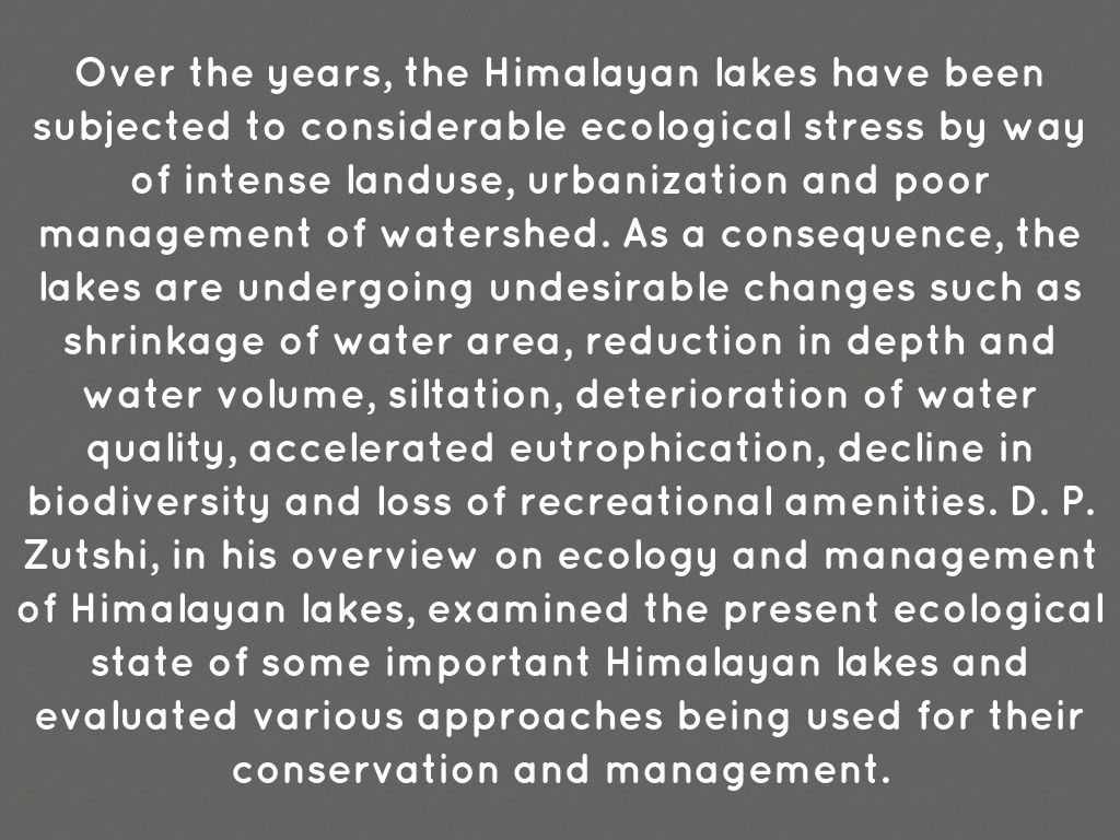 Over the years, the Himalayan lakes have been subjected to considerable ecological stress by way of intense landuse, urbanization and poor management of watershed. As a consequence, the lakes are undergoing undesirable changes such as shrinkage of water area, reduction in depth and water volume, siltation, deterioration of water quality, accelerated eutrophication, decline in biodiversity and loss of recreational amenities. D. P. Zutshi, in his overview on ecology and management of Himalayan lakes, examined the present ecological state of some important Himalayan lakes and evaluated various approaches being used for their conservation and management.