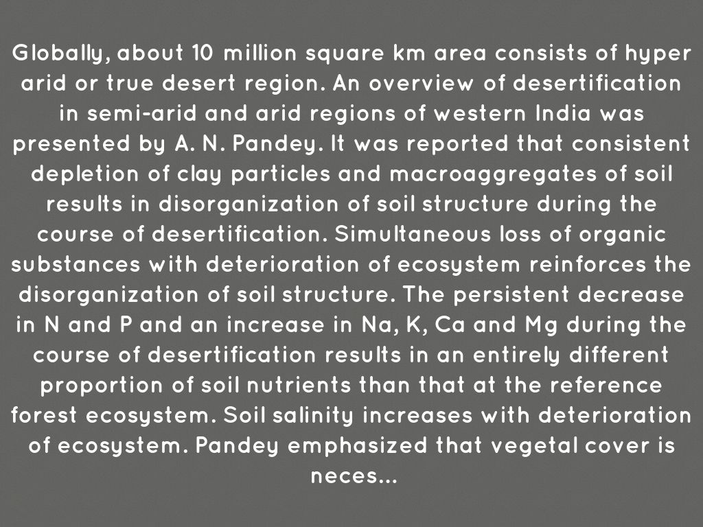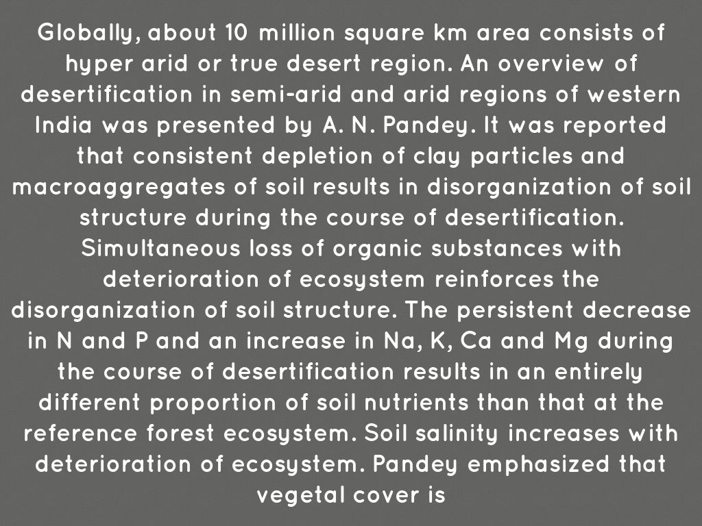 Globally, about 10 million square km area consists of hyper arid or true desert region. An overview of desertification in semi-arid and arid regions of western India was presented by A. N. Pandey. It was reported that consistent depletion of clay particles and macroaggregates of soil results in disorganization of soil structure during the course of desertification. Simultaneous loss of organic substances with deterioration of ecosystem reinforces the disorganization of soil structure. The persistent decrease in N and P and an increase in Na, K, Ca and Mg during the course of desertification results in an entirely different proportion of soil nutrients than that at the reference forest ecosystem. Soil salinity increases with deterioration of ecosystem. Pandey emphasized that vegetal cover is