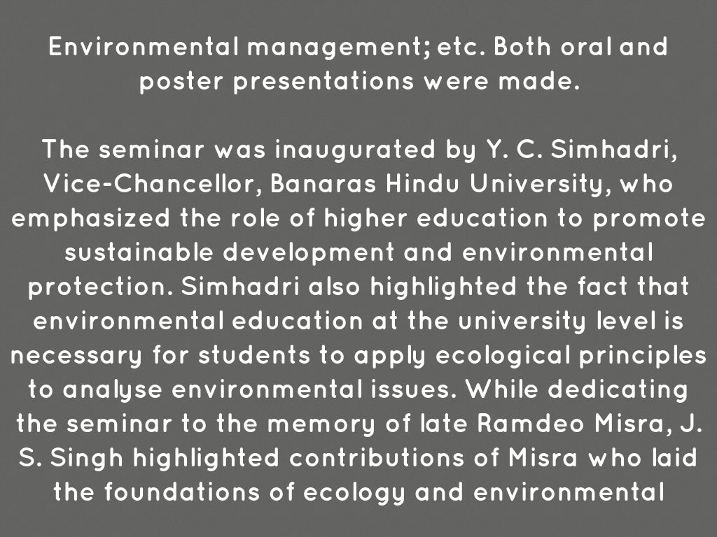The seminar was inaugurated by Y. C. Simhadri, Vice-Chancellor, Banaras Hindu University, who emphasized the role of higher education to promote sustainable development and environmental protection. Simhadri also highlighted the fact that environmental education at the university level is necessary for students to apply ecological principles to analyse environmental issues. While dedicating the seminar to the memory of late Ramdeo Misra, J. S. Singh highlighted contributions of Misra who laid the foundations of ecology and environmental