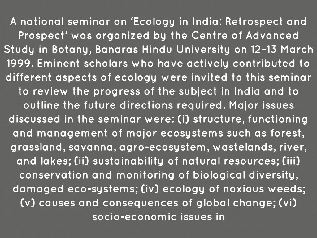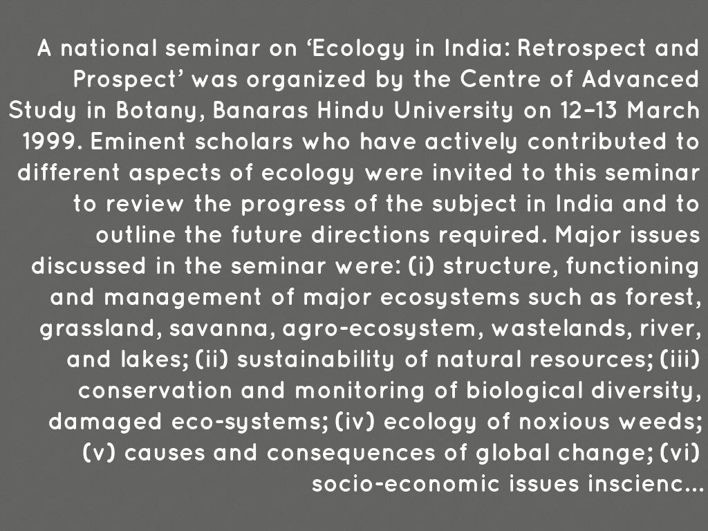 A national seminar on ‘Ecology in India: Retrospect and Prospect’ was organized by the Centre of Advanced Study in Botany, Banaras Hindu University on 12–13 March 1999. Eminent scholars who have actively contributed to different aspects of ecology were invited to this seminar to review the progress of the subject in India and to outline the future directions required. Major issues discussed in the seminar were: (i) structure, functioning and management of major ecosystems such as forest, grassland, savanna, agro-ecosystem, wastelands, river, and lakes; (ii) sustainability of natural resources; (iii) conservation and monitoring of biological diversity, damaged eco-systems; (iv) ecology of noxious weeds; (v) causes and consequences of global change; (vi) socio-economic issues in