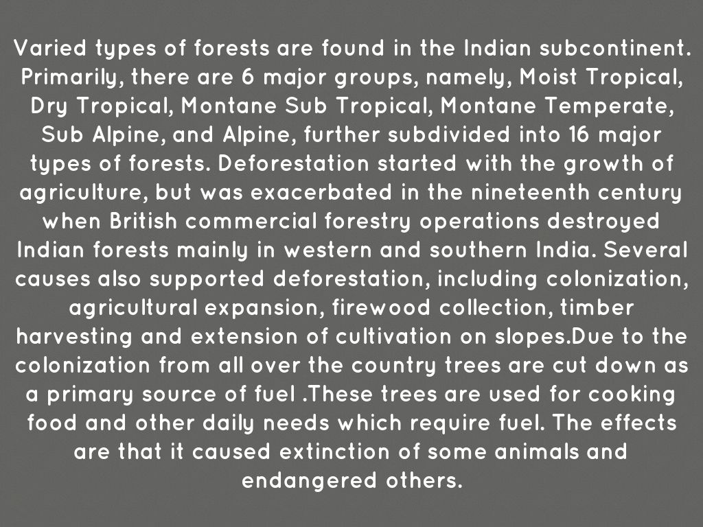 Varied types of forests are found in the Indian subcontinent. Primarily, there are 6 major groups, namely, Moist Tropical, Dry Tropical, Montane Sub Tropical, Montane Temperate, Sub Alpine, and Alpine, further subdivided into 16 major types of forests. Deforestation started with the growth of agriculture, but was exacerbated in the nineteenth century when British commercial forestry operations destroyed Indian forests mainly in western and southern India. Several causes also supported deforestation, including colonization, agricultural expansion, firewood collection, timber harvesting and extension of cultivation on slopes.Due to the colonization from all over the country trees are cut down as a primary source of fuel .These trees are used for cooking food and other daily needs which require fuel. The effects are that it caused extinction of some animals and endangered others.