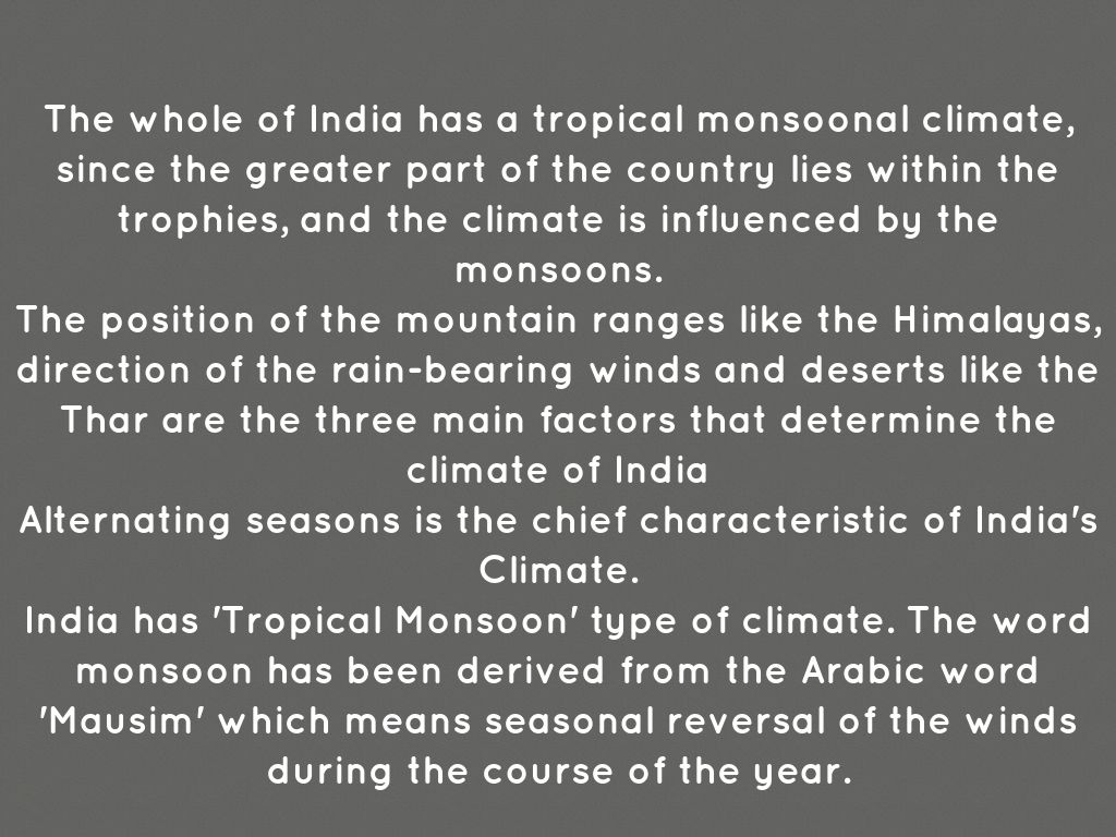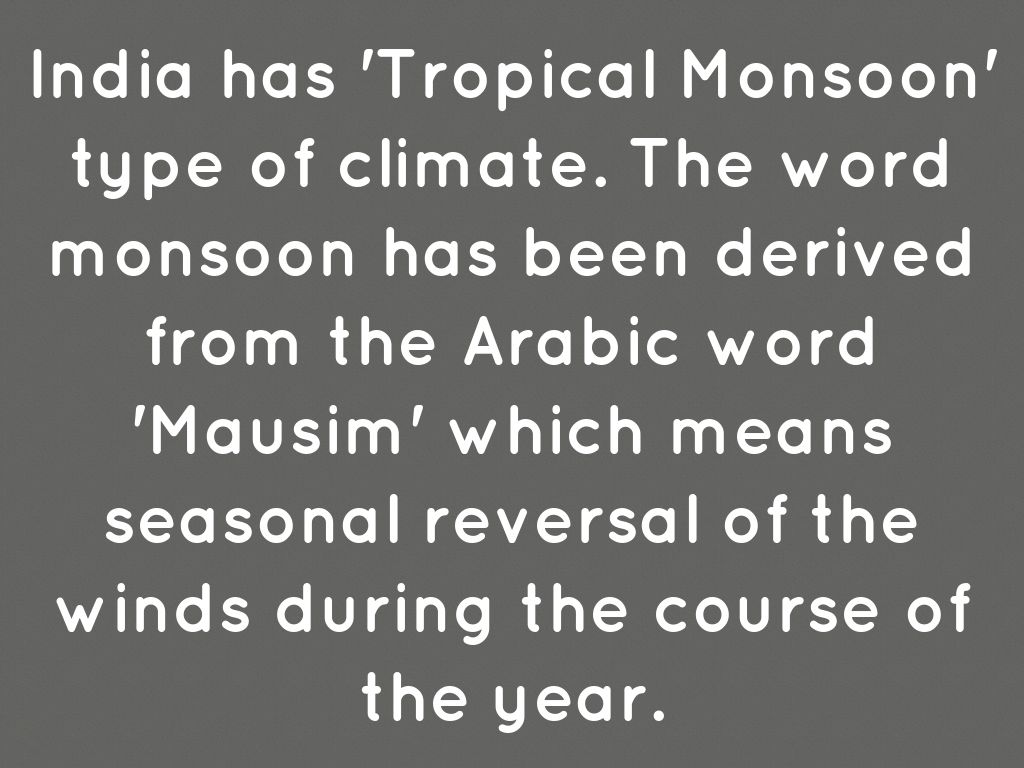 India has 'Tropical Monsoon' type of climate. The word monsoon has been derived from the Arabic word 'Mausim' which means seasonal reversal of the winds during the course of the year.