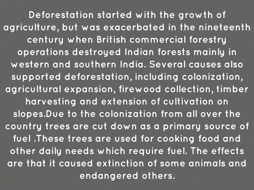 Deforestation started with the growth of agriculture, but was exacerbated in the nineteenth century when British commercial forestry operations destroyed Indian forests mainly in western and southern India. Several causes also supported deforestation, including colonization, agricultural expansion, firewood collection, timber harvesting and extension of cultivation on slopes.Due to the colonization from all over the country trees are cut down as a primary source of fuel .These trees are used for cooking food and other daily needs which require fuel. The effects are that it caused extinction of some animals and endangered others.