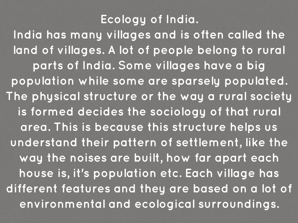India has many villages and is often called the land of villages. A lot of people belong to rural parts of India. Some villages have a big population while some are sparsely populated. The physical structure or the way a rural society is formed decides the sociology of that rural area. This is because this structure helps us understand their pattern of settlement, like the way the noises are built, how far apart each house is, it's population etc. Each village has different features and they are based on a lot of environmental and ecological surroundings.