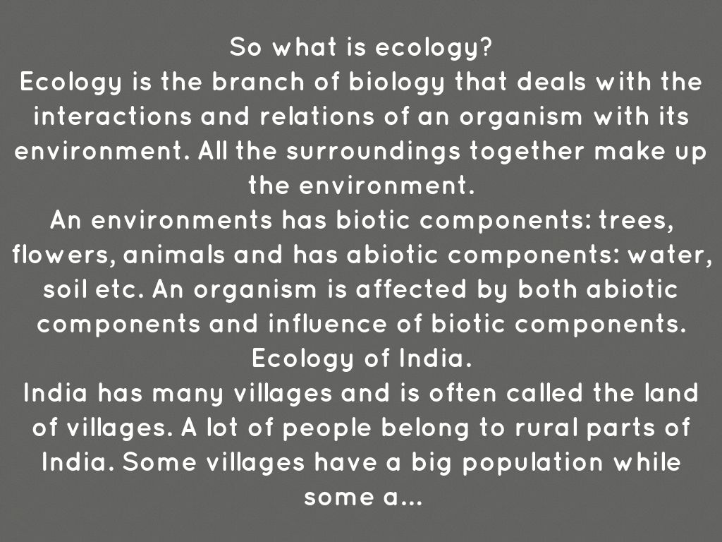 Ecology is the branch of biology that deals with the interactions and relations of an organism with its environment. All the surroundings together make up the environment.