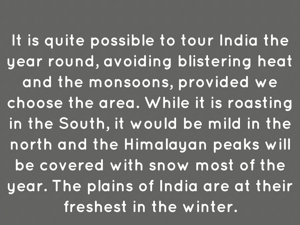 It is quite possible to tour India the year round, avoiding blistering heat and the monsoons, provided we choose the area. While it is roasting in the South, it would be mild in the north and the Himalayan peaks will be covered with snow most of the year. The plains of India are at their freshest in the winter.