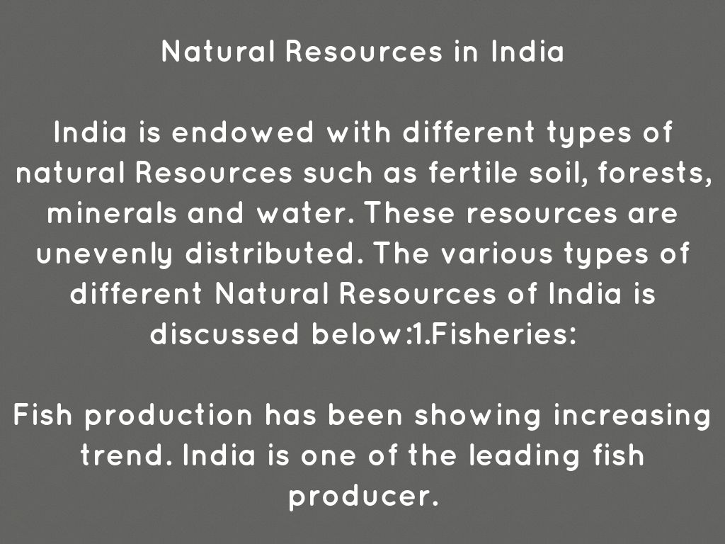 India is endowed with different types of natural Resources such as fertile soil, forests, minerals and water. These resources are unevenly distributed. The various types of different Natural Resources of India is discussed below:1.Fisheries:
