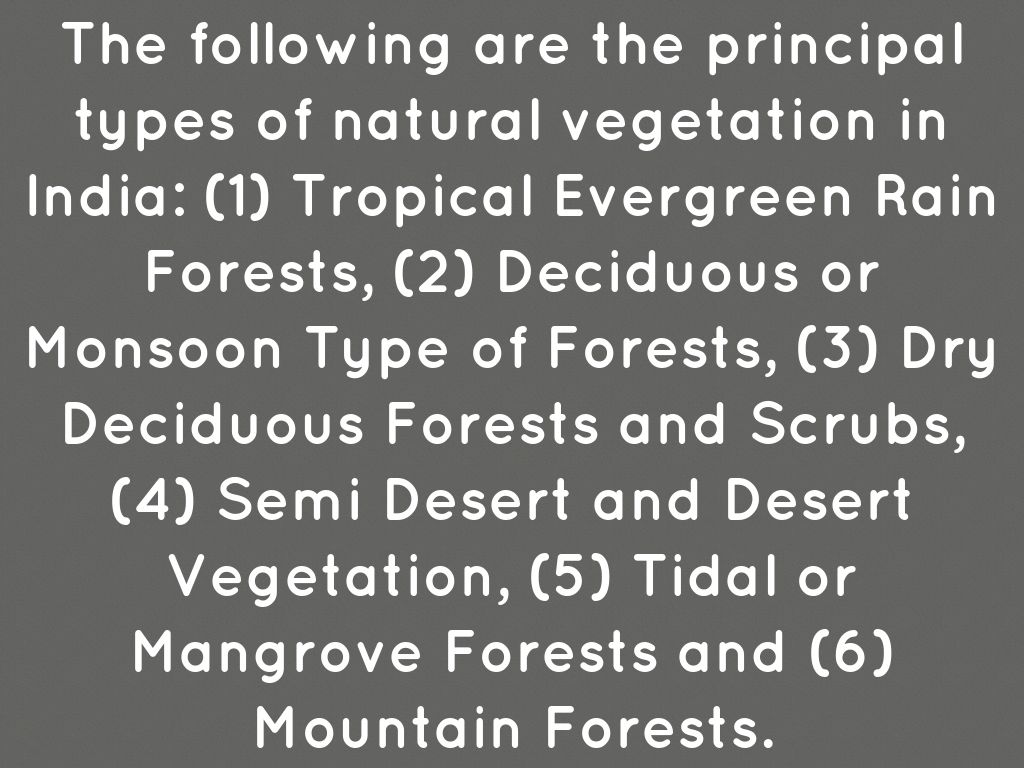 The following are the principal types of natural vegetation in India: (1) Tropical Evergreen Rain Forests, (2) Deciduous or Monsoon Type of Forests, (3) Dry Deciduous Forests and Scrubs, (4) Semi Desert and Desert Vegetation, (5) Tidal or Mangrove Forests and (6) Mountain Forests.