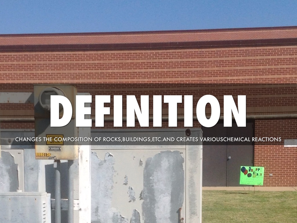CHANGES THE COMPOSITION OF ROCKS,BUILDINGS,ETC.AND CREATES VARIOUSCHEMICAL REACTIONS