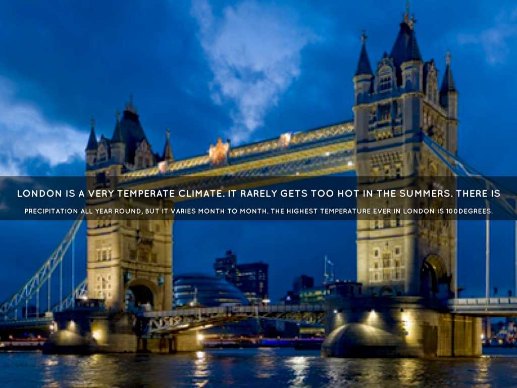 LONDON IS A VERY TEMPERATE CLIMATE. IT RARELY GETS TOO HOT IN THE SUMMERS. THERE IS
