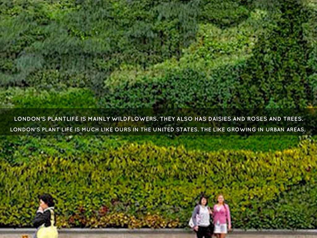 LONDON'S PLANTLIFE IS MAINLY WILDFLOWERS. THEY ALSO HAS DAISIES AND ROSES AND TREES.