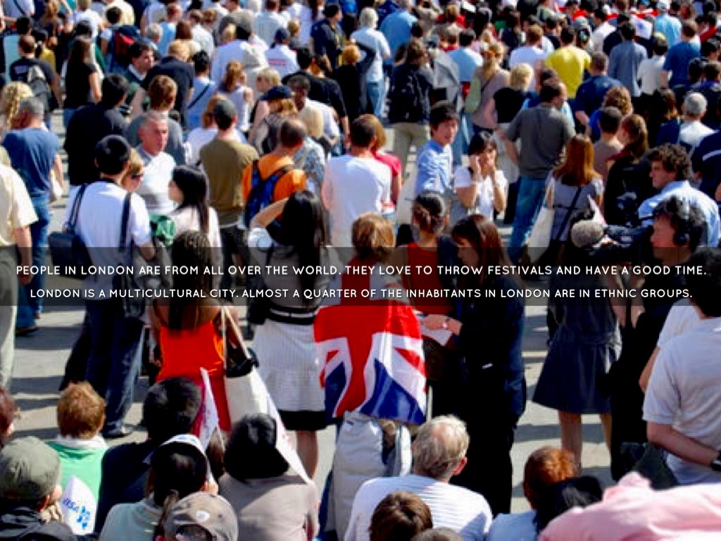 PEOPLE IN LONDON ARE FROM ALL OVER THE WORLD. THEY LOVE TO THROW FESTIVALS AND HAVE A GOOD TIME.