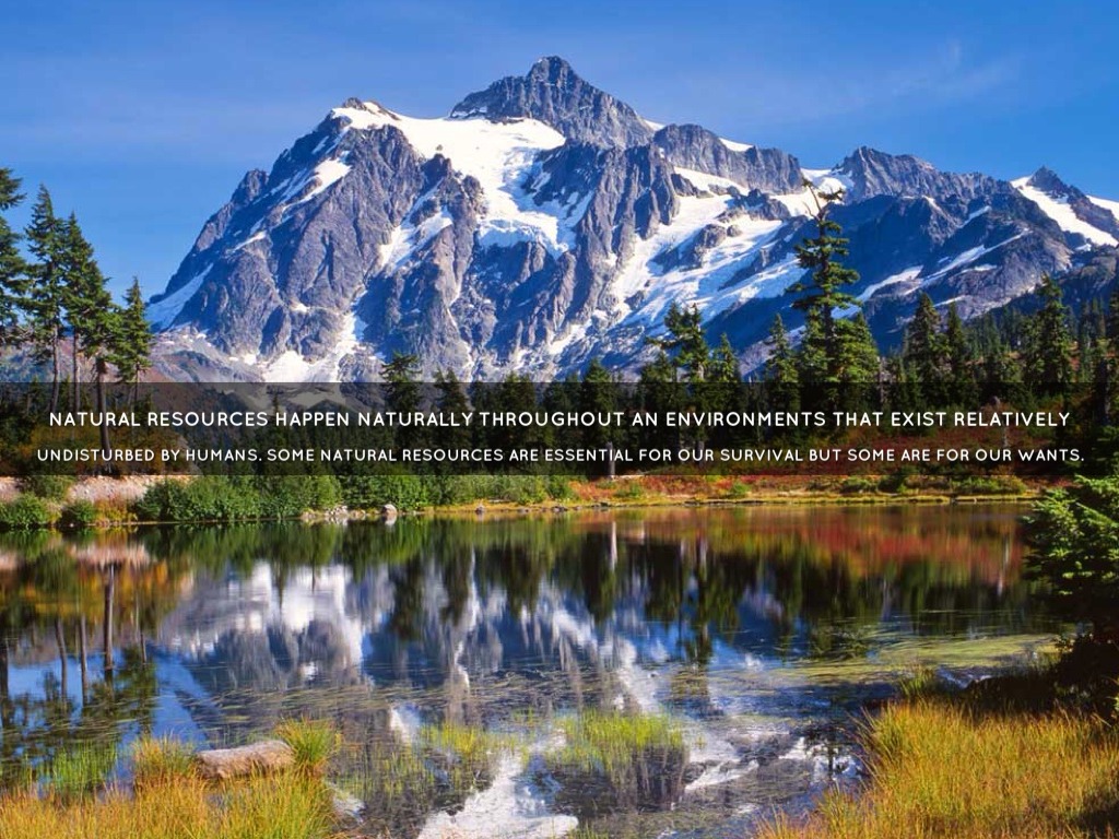 UNDISTURBED BY HUMANS. SOME NATURAL RESOURCES ARE ESSENTIAL FOR OUR SURVIVAL BUT SOME ARE FOR OUR WANTS.