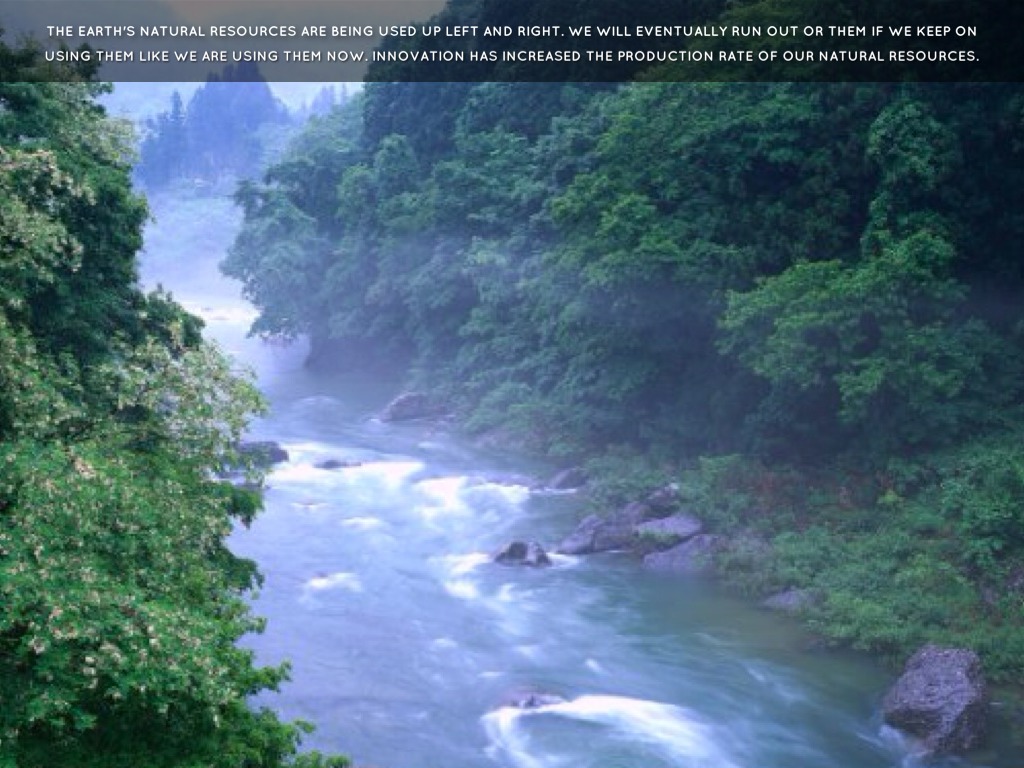 THE EARTH'S NATURAL RESOURCES ARE BEING USED UP LEFT AND RIGHT. WE WILL EVENTUALLY RUN OUT OR THEM IF WE KEEP ON