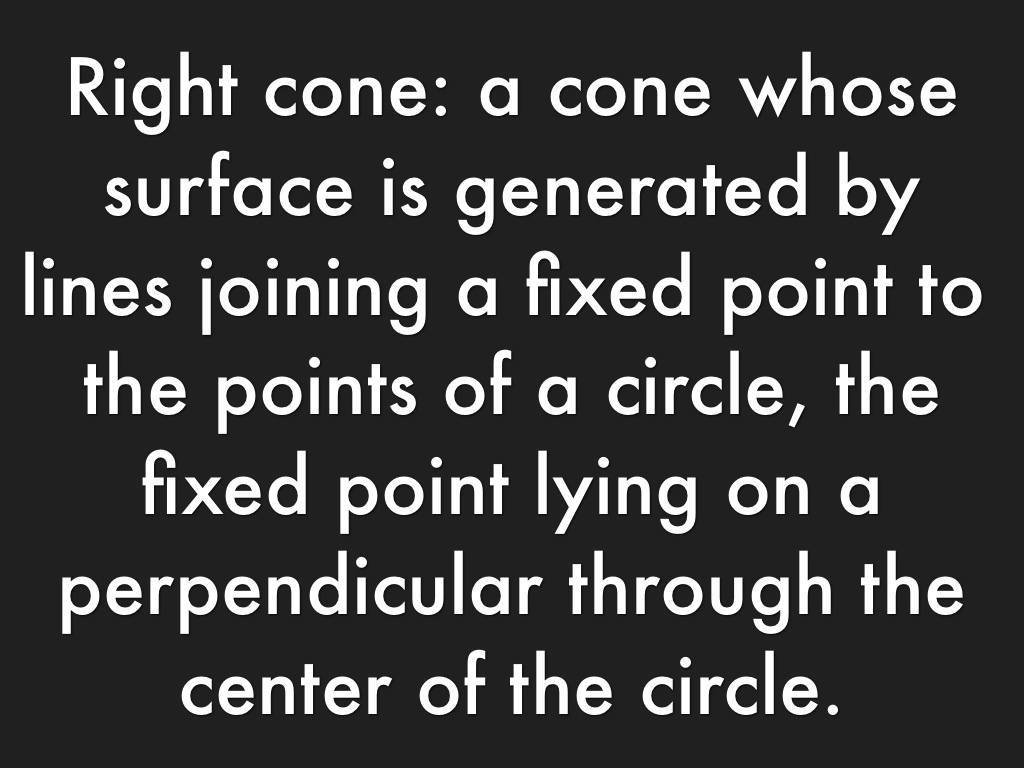 Right cone: a cone whose surface is generated by lines joining a fixed point to the points of a circle, the fixed point lying on a perpendicular through the center of the circle.