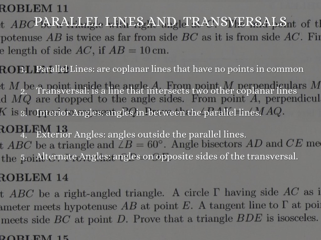 - Alternate Interior Angles: pairs of angles that are in-between the parallel