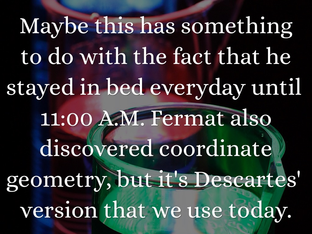 Maybe this has something to do with the fact that he stayed in bed everyday until 11:00 A.M. Fermat also discovered coordinate geometry, but it's Descartes' version that we use today.
