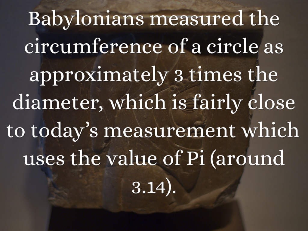 Babylonians measured the circumference of a circle as approximately 3 times the diameter, which is fairly close to today’s measurement which uses the value of Pi (around 3.14).