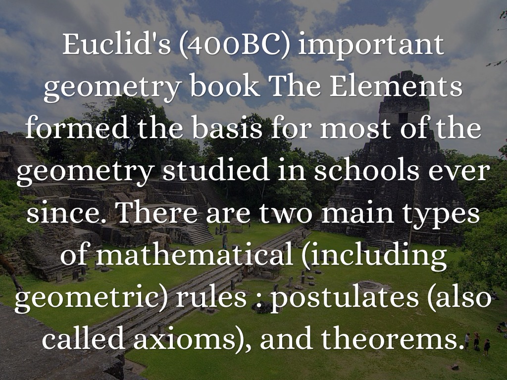 Euclid's (400BC) important geometry book The Elements formed the basis for most of the geometry studied in schools ever since. There are two main types of mathematical (including geometric) rules : postulates (also called axioms), and theorems.
