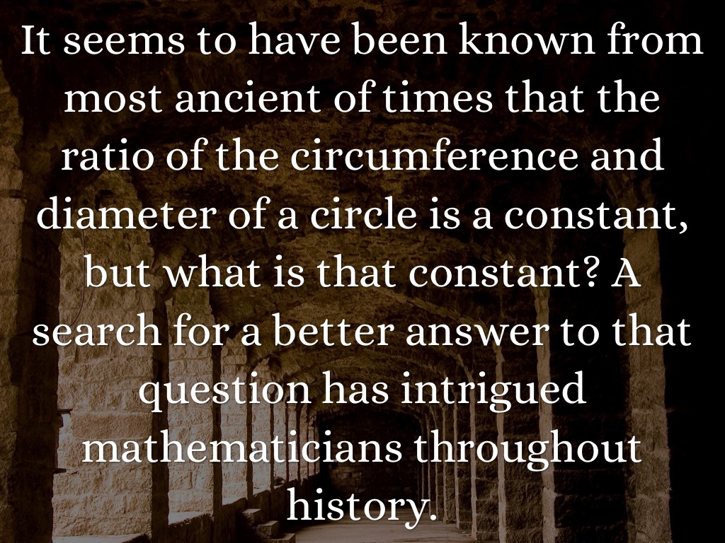 It seems to have been known from most ancient of times that the ratio of the circumference and diameter of a circle is a constant, but what is that constant? A search for a better answer to that question has intrigued mathematicians throughout history.